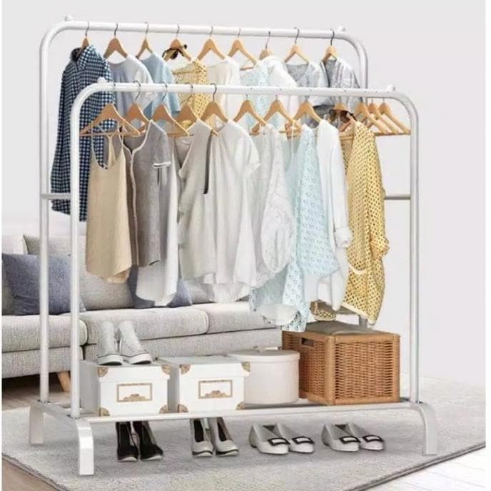 Gantungan baju rak lemari jemuran stand hanger tempat pakaian sepatu double rak.